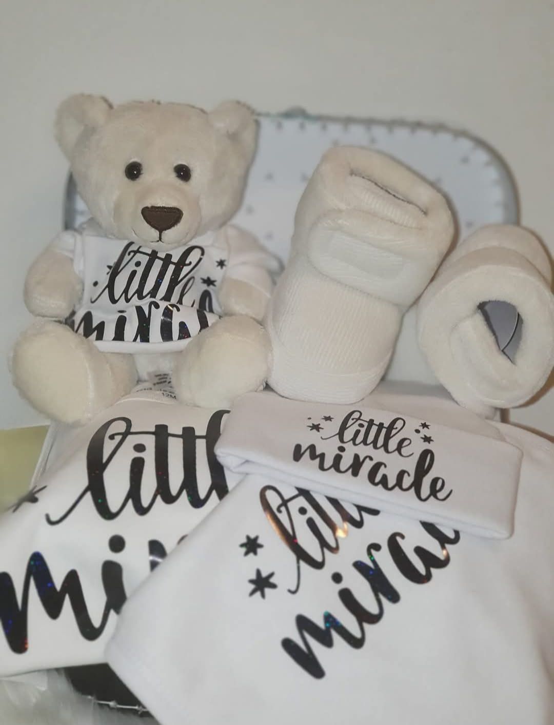 • Wit babyrompertje en blauw konijnenknuffelpakje, beide met de opdruk Wit babyrompertje en blauw konijnenknuffelpakje, beide met de opdruk